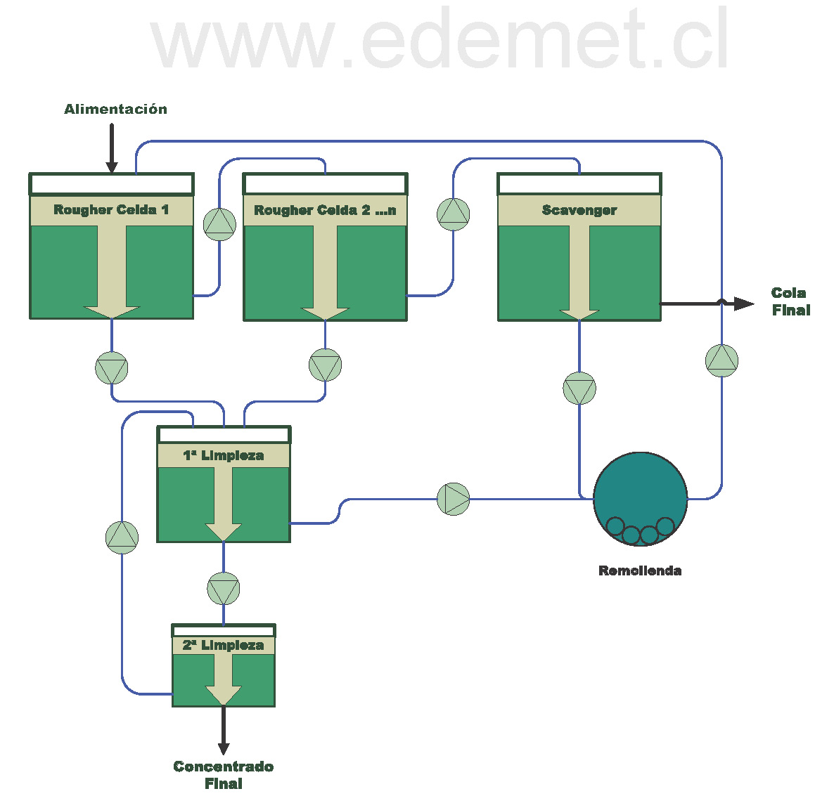 Con el objeto de aproximarse a una simulación o reproducción de resultados metalúrgicos de un circuito industrial de flotación, normalmente se realizan una serie de pruebas de flotación batch a pequeña escala. Estas pruebas son comúnmente conocidas como pruebas de ciclo, pudiendo hacerse en circuito abierto y más frecuentemente en circuito cerrado. Estas incluyen una etapa rougher, con o sin scavenger, y dos o tres etapas cleaner, con o sin remolienda del concentrado rougher y recirculación de las colas de limpieza a las etapas precedentes respectivamente.