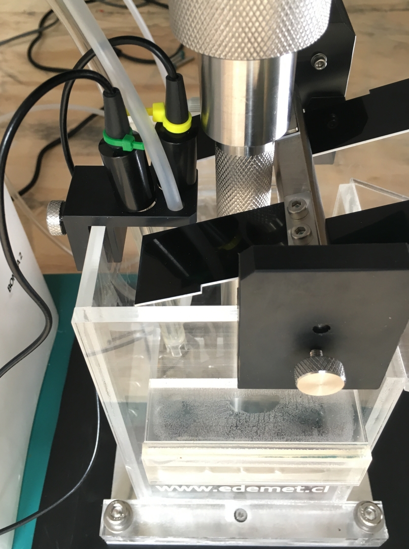 Porta electrodo plástico con sujeción atornillada de acero inoxidable 316. Ideal para dejar fijos 2 electrodos y 2 mangueras a las celdas acrílicas en las pruebas de flotación. Permite el funcionamiento libre de cualquier paleteador automatico en una celda de flotacion EDEMET |